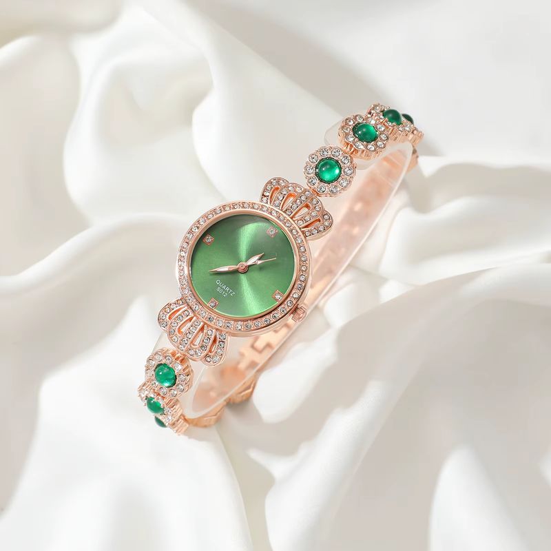 Rosa ouro esmeralda coroa relógio caixa de presente set (desconto de 50% por tempo limitado