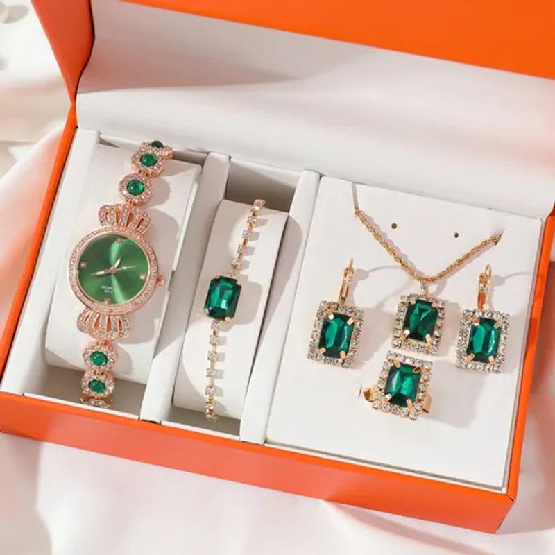 Conjunto de presente de 5 peças, colar, pulseira, anel, brinco, conjunto de relógio de quartzo esmeralda de ouro rosa (50% de desconto por tempo limitado)